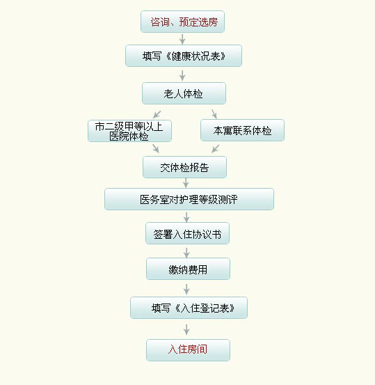 1.长者或监护人提出入住申请,提供老人病历及体检报告(一个月内有效),经评估员初评后,确定可以入住。